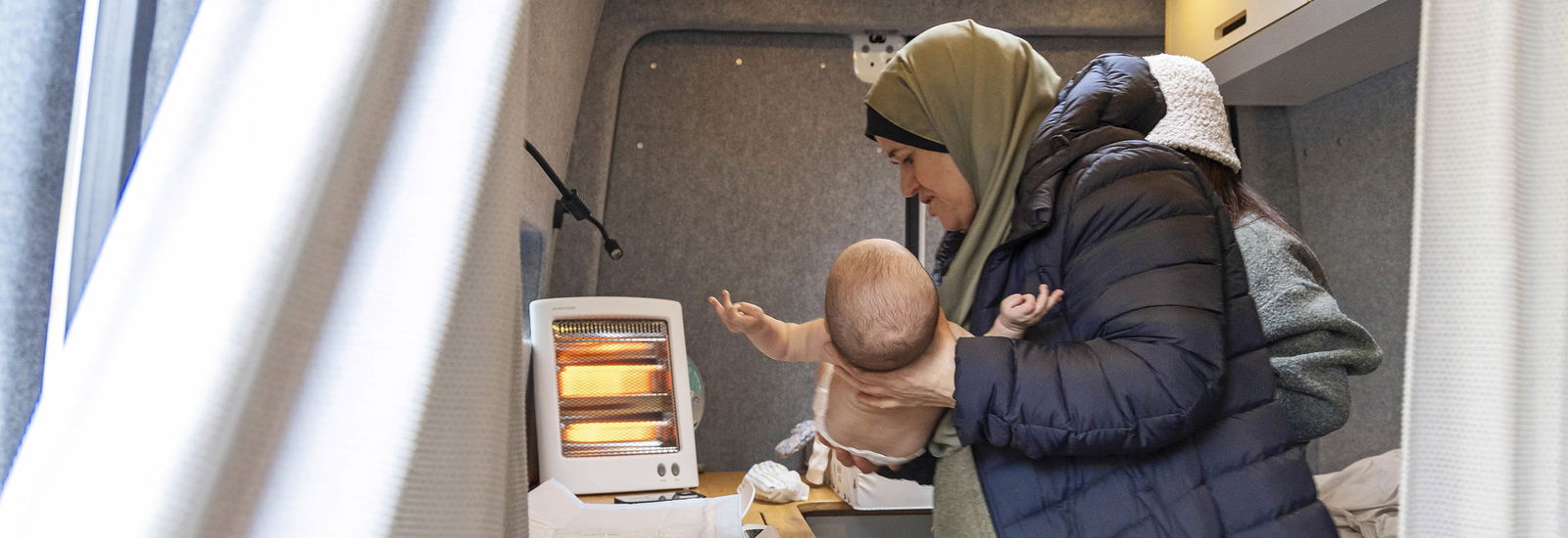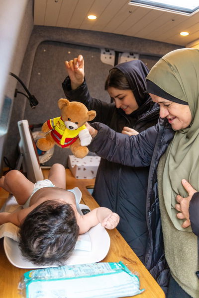 Davor steht Nadia Hassan, die Hebamme. Gesteppte Jacke, ein warmes Lächeln. Sie begrüßt Hubanur Karakulluken, eine junge Mutter, beugt sich über den Kinderwagen und wirft einen kurzen Blick auf das drei Monate alte Baby. Dann bittet sie die 28-Jährige und ihre Tochter hinein in den umgebauten Transporter.